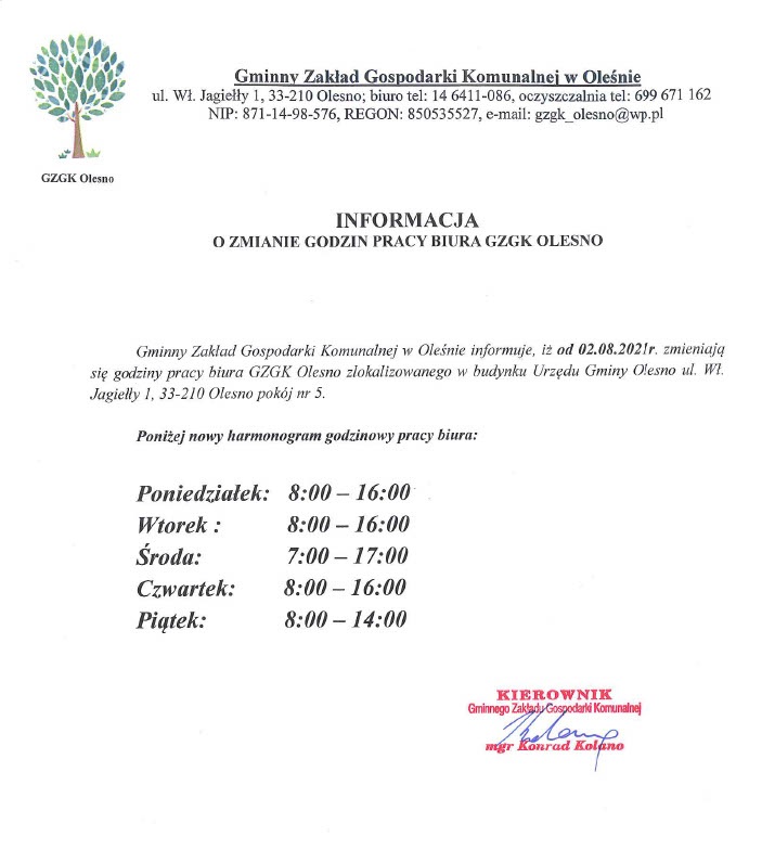 Biuro GZGK Olesno – informacja o zmianie godzin pracy