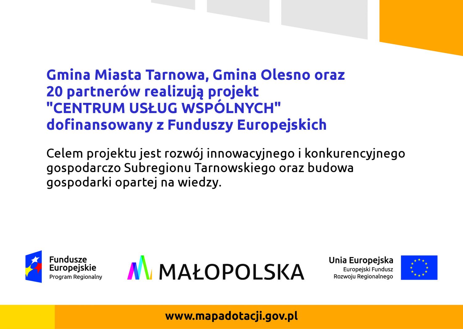 Wartość projektu to prawie 10 mln zł, przy czym dofinansowanie z Regionalnego Programu Operacyjnego na lata 2014-2020 wyniesie 6,2 mln zł. Pomysłodawcą powstania CUW było miasto Tarnów, w projekt włączyło się 21 partnerów z subregionu tarnowskiego: powiat tarnowski oraz gminy: Bolesław, Ciężkowice, Dąbrowa Tarnowska, Gnojnik, Gręboszów, Iwkowa, Mędrzechów, Olesno, Pleśna, Radłów, Ryglice, Skrzyszów, Szczucin, Szczurowa, Szerzyny, Tuchów, Wierzchosławice, Wojnicz, Zakliczyn i Żabno.