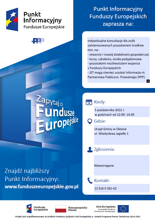 Urząd Gminy w Oleśnie uprzejmie informuje, że 5 października 2022 r. (środa) w godzinach od 12:00- 14:30 w świetlicy Urzędu Gminy Olesno odbędzie się dyżur konsultanta ds.[nbsp] Funduszy Europejskich. Zapraszamy zainteresowanych pozyskaniem środków m.in. na: