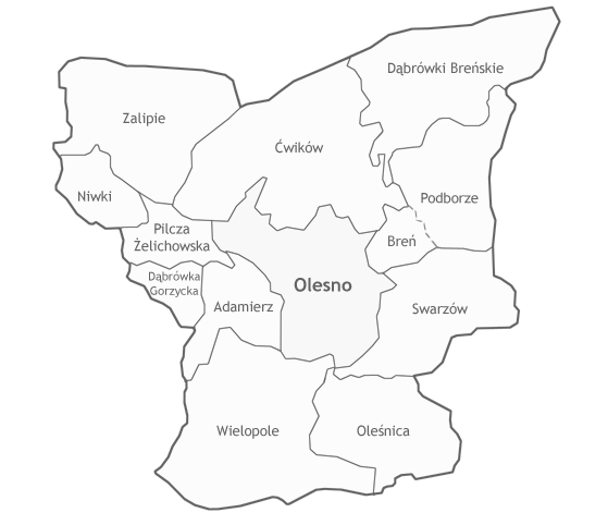 Teren gminy pokrywa dość gęsta sieć dróg lokalnych, łączących poszczególne wsie, przebiega także lokalna linia kolejowa Szczucin – Tarnów, obecnie jednak niewykorzystywana, oraz Turystyczny Szlak Pieszy na trasie Dąbrowa Tarnowska – Ujście Jezuickie. Gmina Olesno graniczy z gminami Mędrzechów, Bolesław, Gręboszów oraz Żabno. Olesno jest gminą średniej wielkości, zajmuje obszar 77,6 km² i liczy 7 931 ludności. Olesno jako siedziba gminy i większości instytucji, stanowi naturalny ośrodek usługowy dla swoich trzynastu sołectw: Adamierz, Breń, Ćwików, Dąbrówka Gorzycka, Dąbrówki Breńskie, Niwki, Oleśnica, Pilcza Żelichowska, Podborze, Swarzów, Wielopole, Zalipie, Olesno.