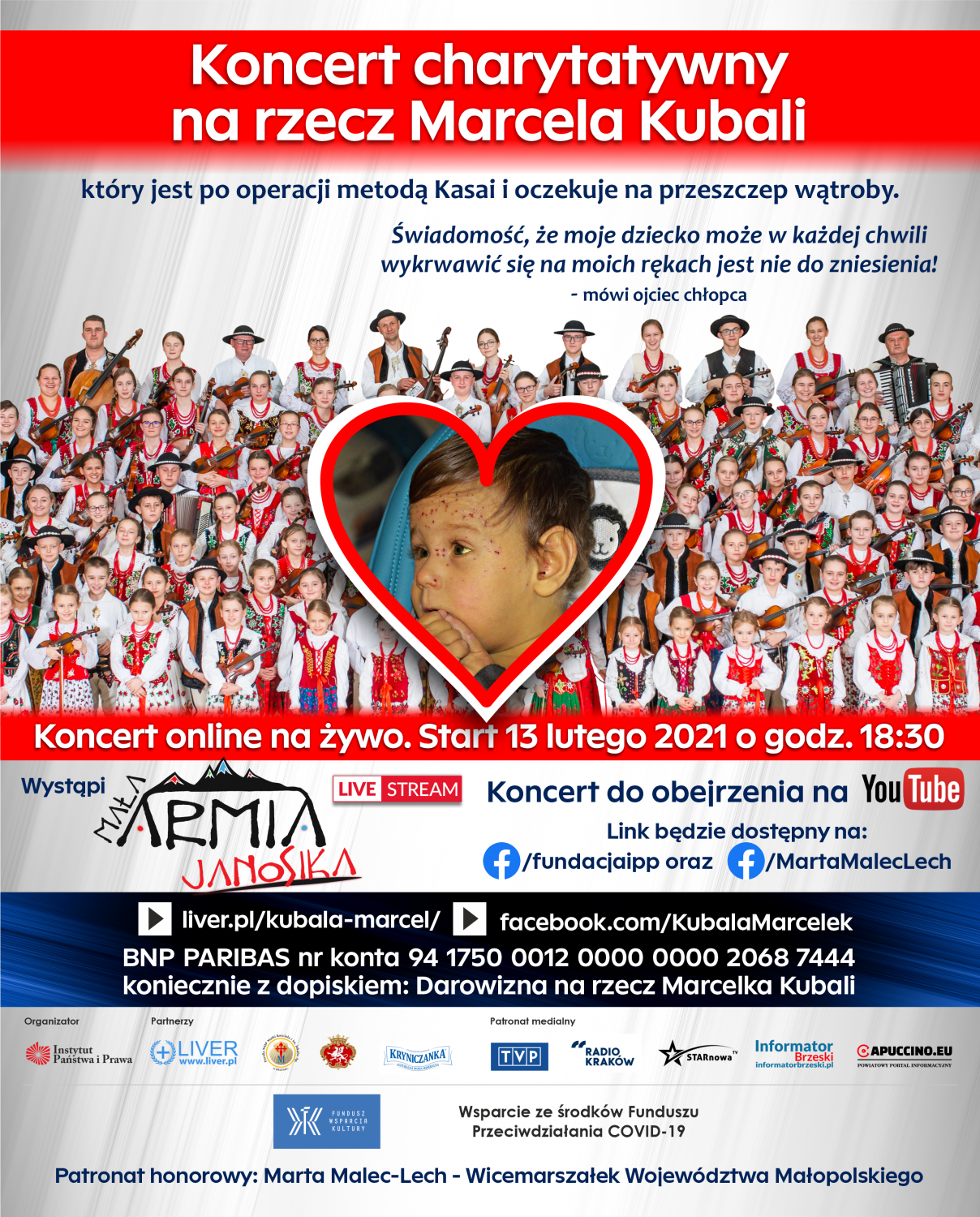 Aby przeżyć Marcel musi zgromadzić 8 mln złotych na przeszczep wątroby w Stanach Zjednoczonych. Dlatego 13 lutego o godzinie 18:30 dzięki uprzejmości księdza proboszcza Józefa Drabika odbędzie się w parafii NMP Matki Kościoła i św. Jakuba Apostoła w Brzesku koncert charytatywny w formule online na rzecz Marcela. Patronami medialnymi koncertu będą TVP, która przygotowuje materiał o Marcelu oraz Radio Kraków. W koncercie weźmie udział znany zespół dziecięcy „Mała Armia Janosika”. Link do obejrzenia koncertu będzie można znaleźć na mojej stronie facebookowej Marta Malec-Lech oraz na stronie facebookowej Fundacji Instytut Państwa i Prawa.