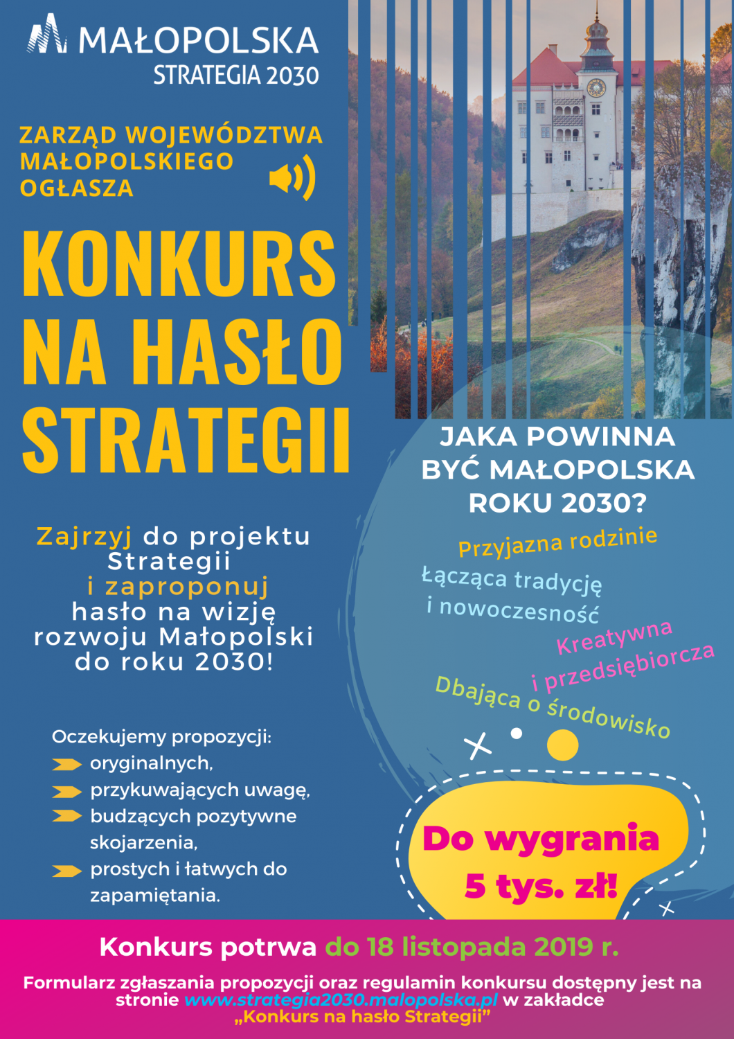 Uprzejmie informujemy, że Uchwałą nr 1897/19 z dnia 17 października br. Zarząd Województwa Małopolskiego ogłosił konkurs na hasło Strategii Rozwoju Województwa „Małopolska 2030”. Konkurs adresowany jest do wszystkich mieszkańców regionu, a jego celem jest włączenie Małopolan w prace nad tym dokumentem.