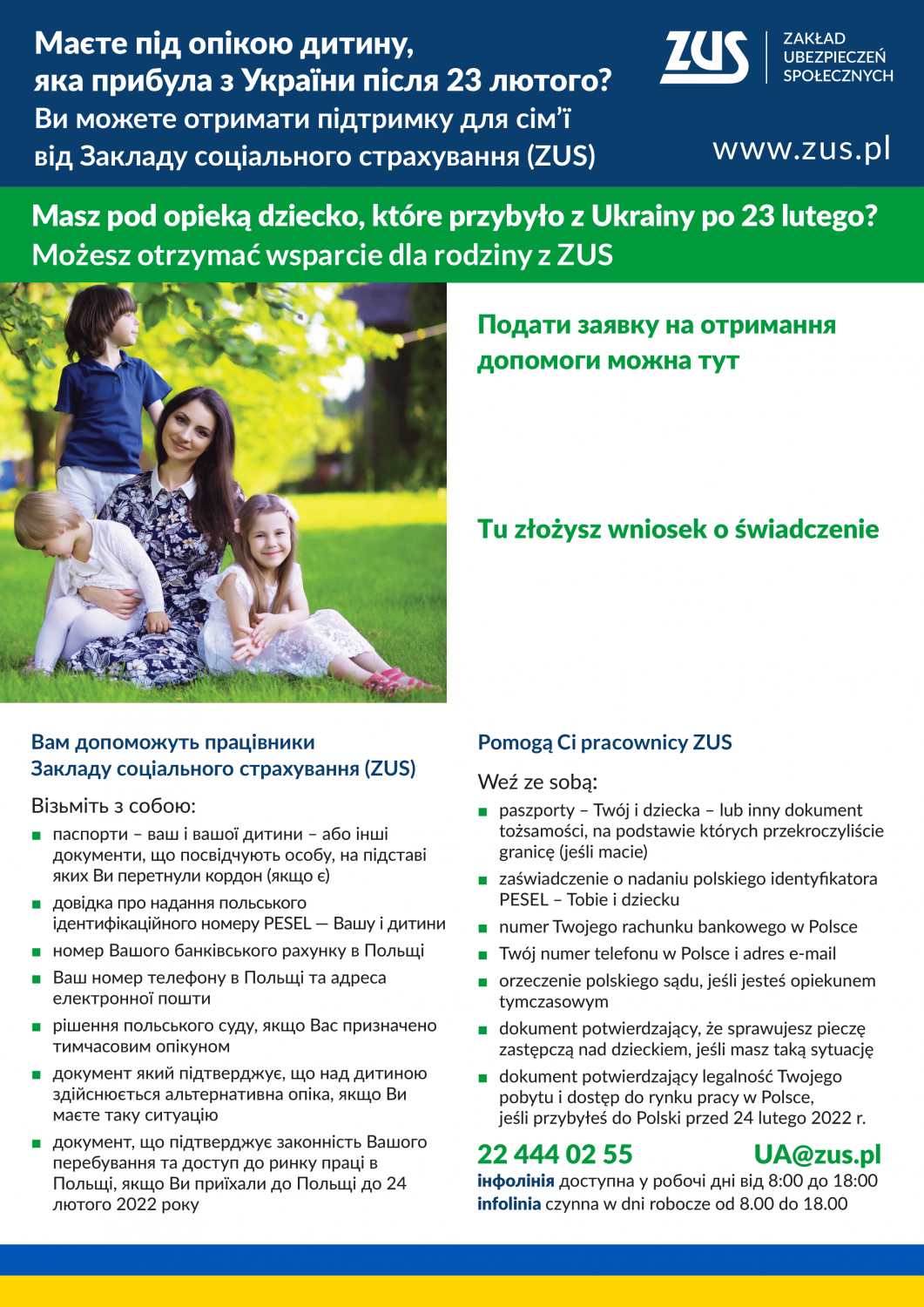 w najbliższy weekend, 26-27 marca br. w godz. 9.00-15.00, Oddział ZUS w Tarnowie oraz Inspektorat ZUS w Bochni organizuje akcję WEEKEND DLA UKRAINY. Obywatele Ukrainy, którzy przekroczyli granicę Polski po 23 lutego br. w związku z działaniami wojennymi mogą złożyć wnioski o świadczenia dla rodziny.