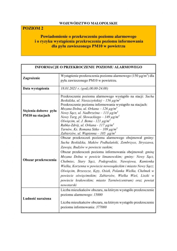 Ostrzeżenie 1 stopnia o zanieczyszczeniu powietrza dla miasta Krakowa, miasta Tarnowa, miasta Nowego Sącza, powiatu brzeskiego, powiatu chrzanowskiego, powiatu dąbrowskiego, powiatu gorlickiego, powiatu krakowskiego, powiatu limanowskiego, powiatu miechowskiego, powiatu myślenickiego, powiatu nowosądeckiego, powiatu nowotarskiego, powiatu oświęcimskiego, powiatu proszowickiego, powiatu suskiego, powiatu tarnowskiego, powiatu wadowickiego