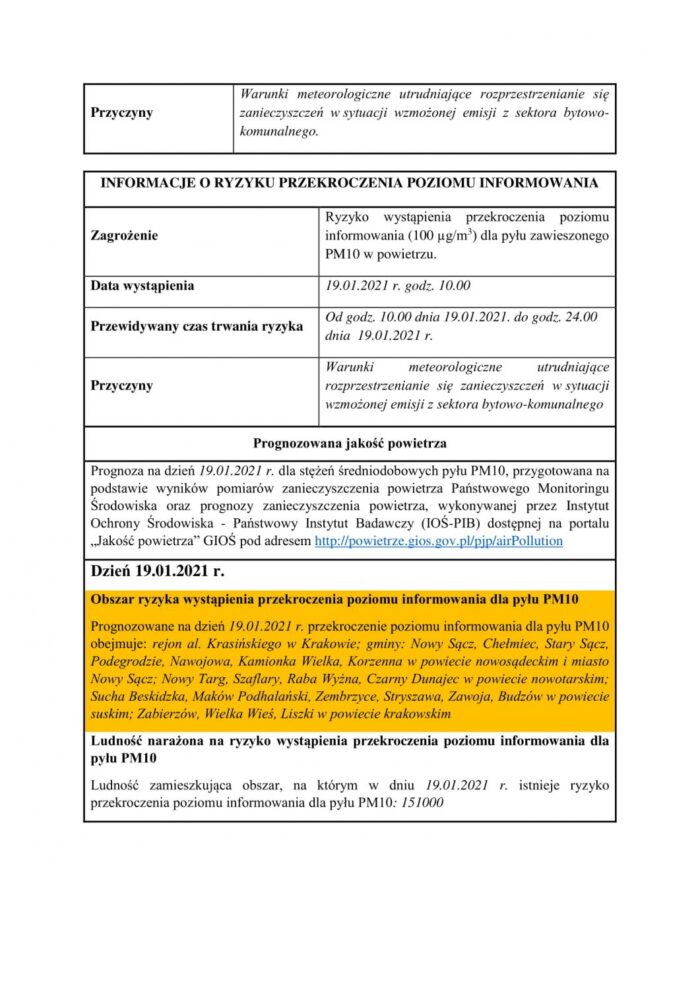 Ostrzeżenie o ryzyku przekroczenia poziomu dopuszczalnego[nbsp]pyłu PM10[nbsp]ze względu na zwiększoną emisję zanieczyszczeń oraz niekorzystne warunki meteorologiczne.