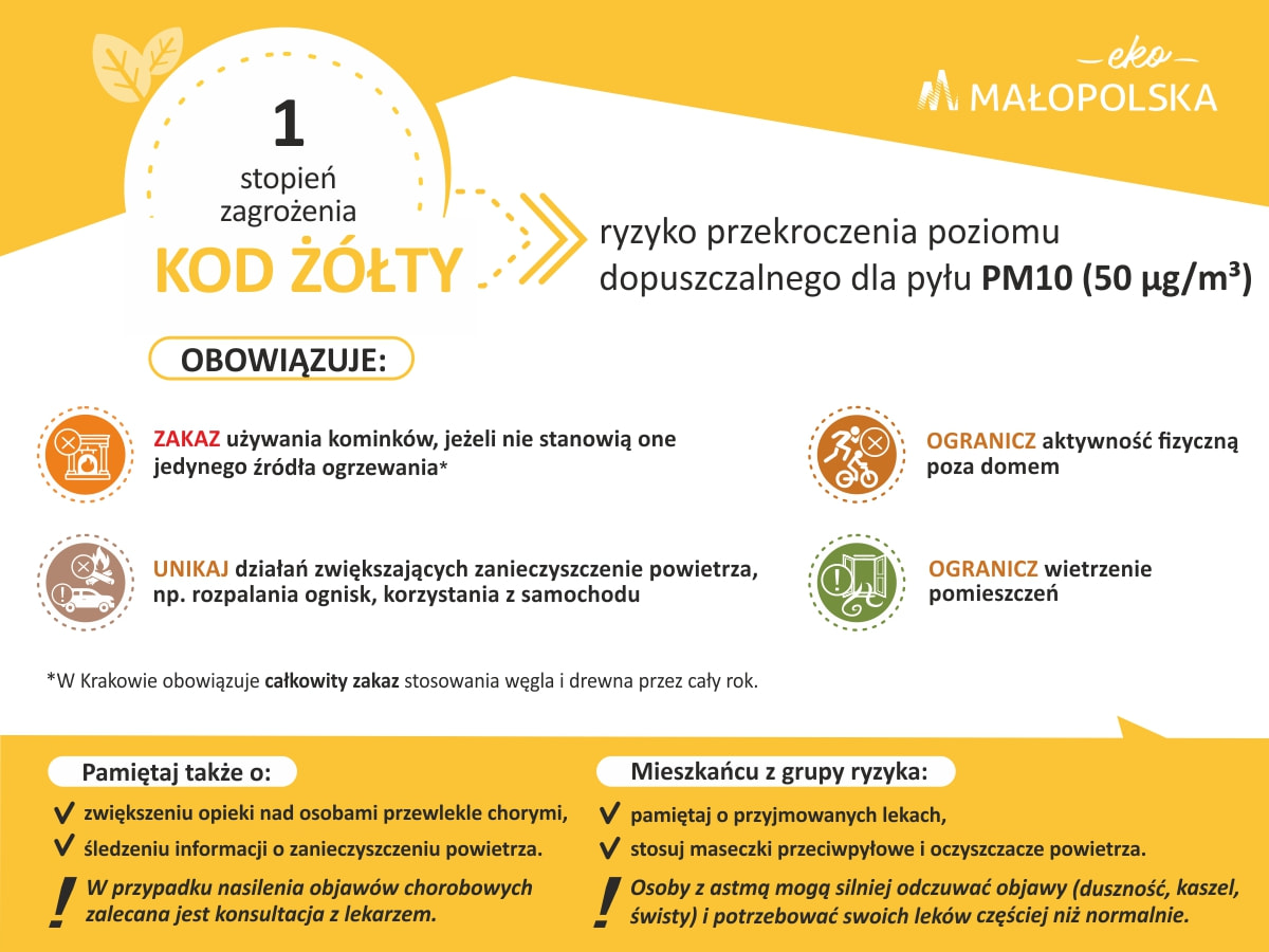 Ostrzeżenie o ryzyku przekroczenia poziomu dopuszczalnego[nbsp]pyłu PM10[nbsp]ze względu na zwiększoną emisję zanieczyszczeń oraz niekorzystne warunki meteorologiczne.