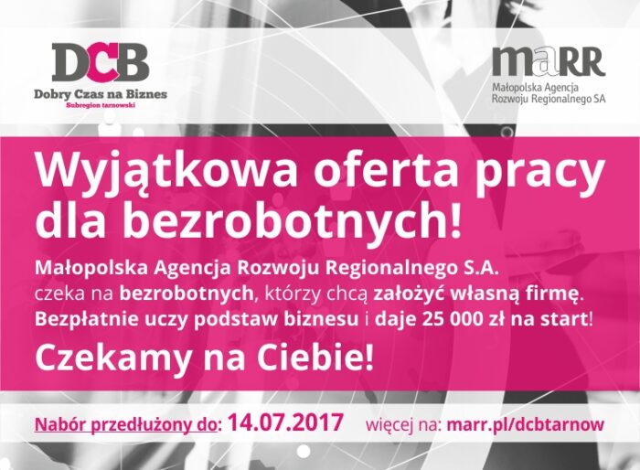 Małopolska Agencja Rozwoju Regionalnego S.A. jako realizator projektu „Dobry Czas na Biznes – Subregion tarnowski” współfinansowanego z Europejskiego Funduszu Społecznego w ramach działania 8.3.1. Regionalnego Programu Operacyjnego WojewództwaMałopolskiego na lata 2014 – 2020 zaprasza do wzięcia udziału w ww. projekcie osoby zamieszkujące powiat dąbrowski chcące założyć własną działalność gospodarczą.