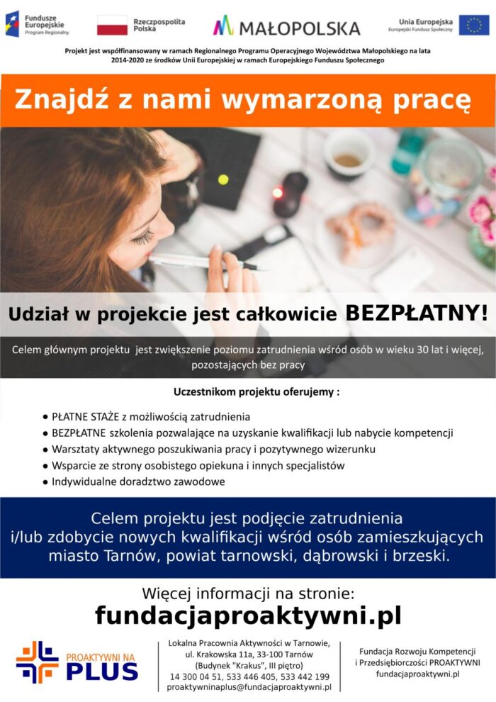 Na terenie miasta Tarnowa oraz powiatu tarnowskiego, dąbrowskiego i brzeskiegorusza nabór do ósmej edycji projektu „Proaktywni na plus”. Projekt jest wsparciem dla osób pozostających bez zatrudnienia na regionalnym rynku pracy.