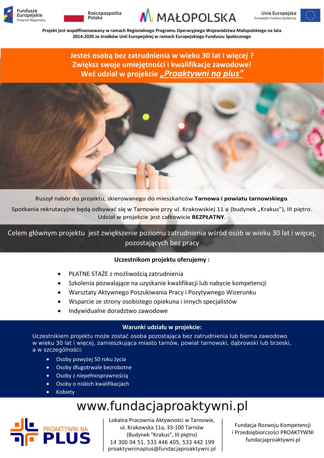 Fundacja Rozwoju Kompetencji i Przedsiębiorczości PROKATYWNIrozpoczęła rekrutację uczestników do projektu.Spotkania odbywać się będą w Tarnowie na ul. Krakowskiej 11a III piętro. Udział w projekcie „Proaktywni na plus” jest całkowicie BEZPŁATNY.