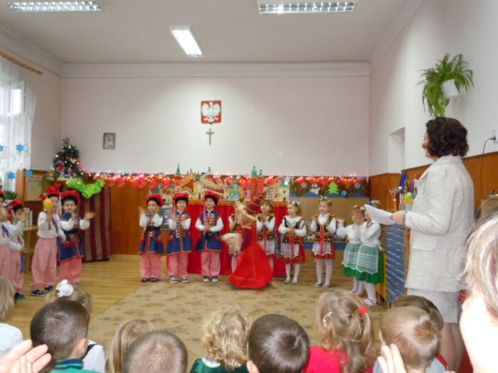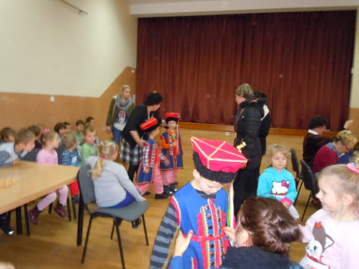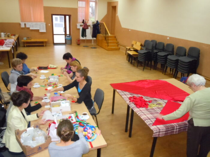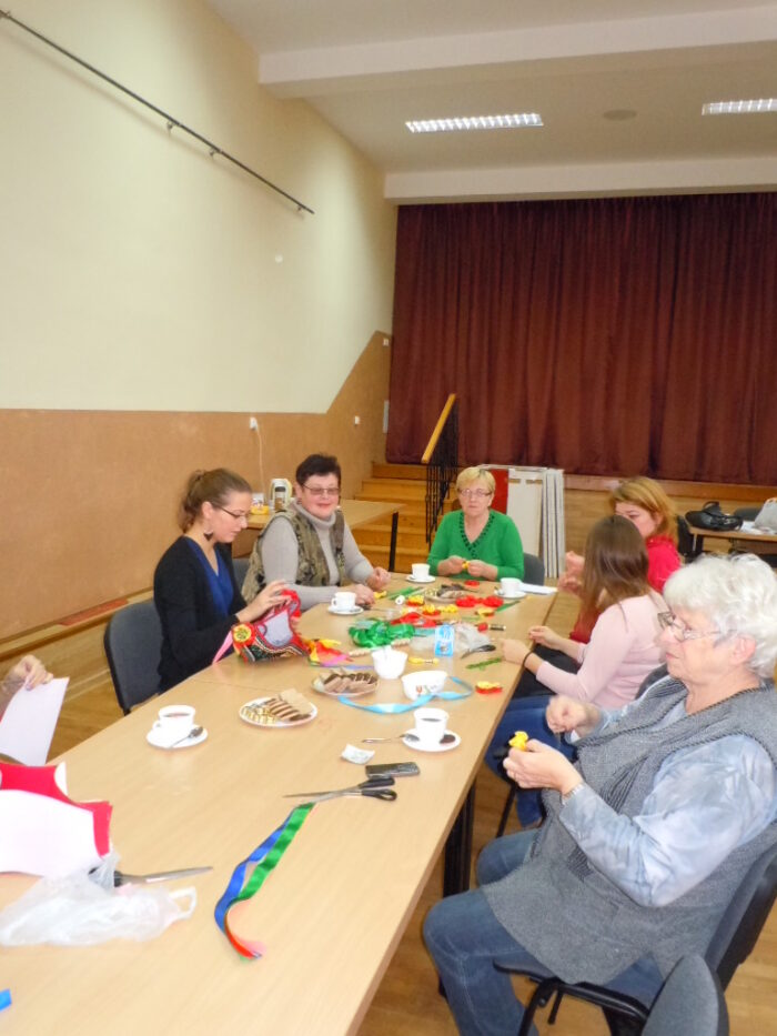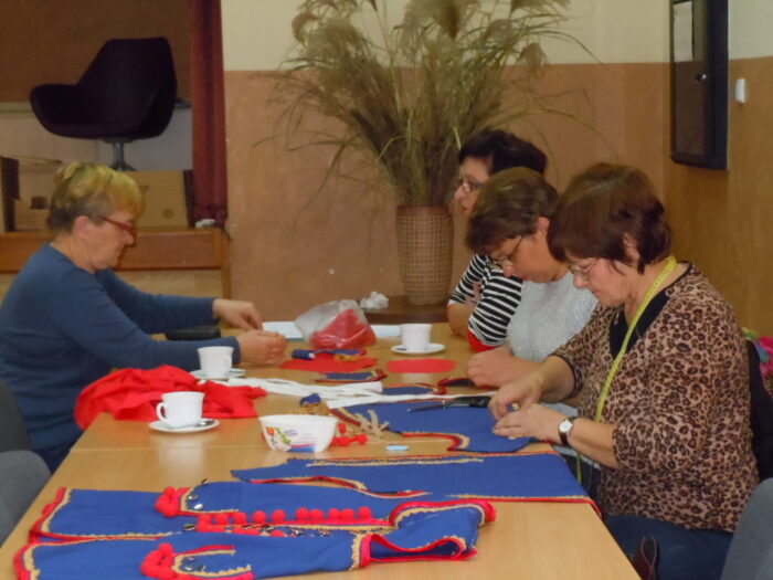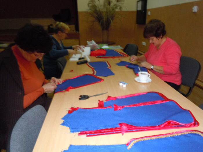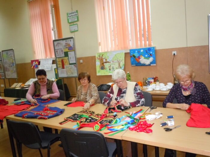 [nbsp][nbsp][nbsp][nbsp][nbsp][nbsp][nbsp][nbsp][nbsp][nbsp][nbsp] Pomysł Pani Zofii Pilas zatytułowany został „Tradycyjny strój regionalny – podstawy wykonania stroju dąbrowskiego dla dziewczynek i chłopców”. Pomysł ten zakładał uszycie[nbsp][nbsp][nbsp][nbsp][nbsp][nbsp][nbsp][nbsp][nbsp][nbsp][nbsp][nbsp] i wyhaftowanie strojów dąbrowskich – 4 dla dziewczynek i 4 dla chłopców. Wykonane stroje miały następnie zostać przekazane do Przedszkola Publicznego w Oleśnie, by służyć przez długie lata kolejnym pokoleniom dzieci z terenu Gminy Olesno. Pierwsze kroki zmierzające do realizacji projektu podjęto w październiku 2014 r. Podczas działań planistycznych przewidziano 8 spotkań, w ramach których przeprowadzono warsztaty szkoleniowe oraz spotkania, podczas których szyto i haftowano stroje dąbrowskie. Spotkania te odbywały się w świetlicy Urzędu Gminy w Oleśnie w dniach: 18.11., 19.11, 25.11., 26.11, 2.12, 3.12, 9.12, 10.12, 16.12., 19.12.2014 r. W realizacji projektu wzięło udział szerokie grono seniorów oraz młodzieży z terenu Gminy Olesno, którzy aktywnie włączyli się w pracę w trakcie warsztatów. Do udziału w projekcie zaproszono także dzieci z Przedszkola Publicznego w Oleśnie, które m.in. wykonywały prace plastyczne o tematyce strojów dąbrowskich. Seniorzy oraz młodzież uczestniczący w warsztatach mieli okazję poznać zasady wykonania strojów dąbrowskich. Warsztaty te były także szansą na podzielenie się doświadczeniami z młodszym pokoleniem oraz integrację społeczności lokalnej. Podczas ostatniego spotkania, które miało miejsce 19 grudnia 2014 r., odbyło się uroczyste zakończenie realizacji warsztatów i przekazanie strojów dąbrowskich do Przedszkola Publicznego w Oleśnie. Z tej okazji przygotowano niezwykłe przedstawienie z udziałem przedszkolaków, które wystąpiły w strojach wykonanych [nbsp][nbsp][nbsp][nbsp][nbsp][nbsp][nbsp][nbsp][nbsp][nbsp][nbsp][nbsp][nbsp][nbsp][nbsp][nbsp][nbsp][nbsp][nbsp][nbsp][nbsp][nbsp][nbsp][nbsp][nbsp][nbsp]w ramach warsztatów. Na przedstawienie przybyło wielu gości, wśród których znaleźli się m.in. Wójt Gminy Olesno – Pan Witold Morawiec, Sekretarz Gminy Olesno – Pan Janusz Plata oraz pomysłodawczyni warsztatów – Pani Zofia Pilas wraz z paniami, które uczestniczyły w warsztatach wykonując stroje dąbrowskie.