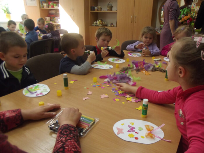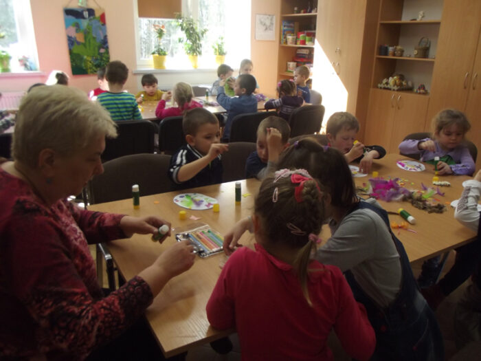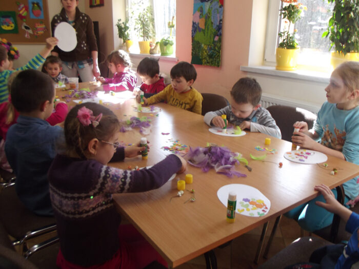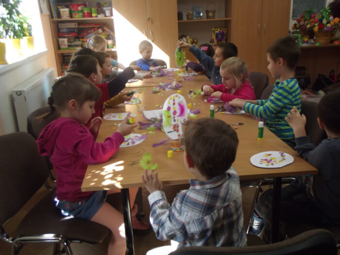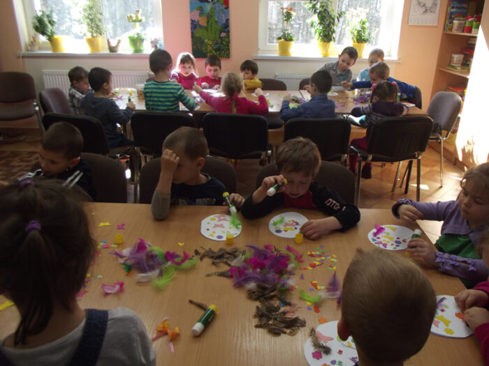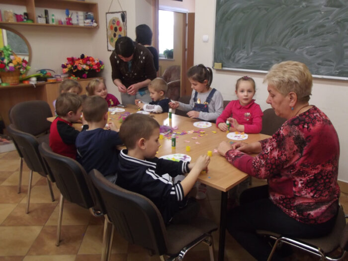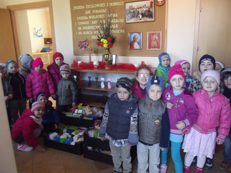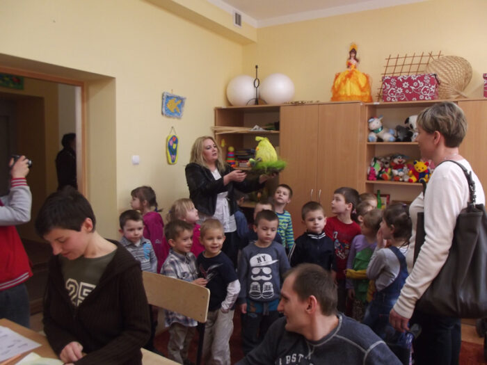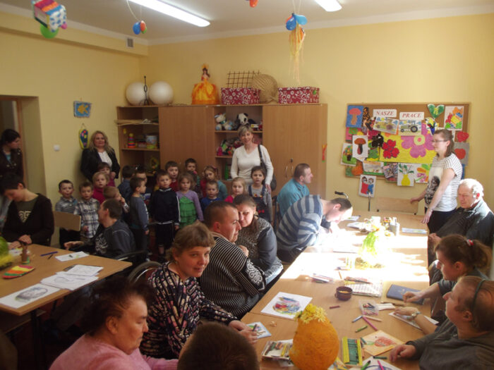 Dnia 26 marca Naszą Placówkę odwiedzili Przedszkolaki z Publicznego Przedszkola w Oleśnie, przysparzając nam wiele niespodzianek i radości. Po przywitaniu przybyłych gości przez Panią Kierownik Ireną Kawę, Przedszkolaki pod okiem Pań Nauczycielek i Terapeutów Naszego Domu, wykonali piękne kartki świąteczne, ozdabiając je różnymi gatunkami materiałów ozdobnych. Kartki miały kształt jajek, na których mieściły się symbole i emblematy świąteczne. Pięknie wykonane kartki dzieci zabrały do swoich domów. Na zakończenie wszyscy oglądnęli wystawę prac konkursowych „Święty Jan Paweł II – Pielgrzym Świata”.Niespodziankę, jaką zrobili nam Przedszkolaki, ich rodzice, nauczyciele i Dyrekcja Przedszkola, wywołała wiele radości i wzruszenia. Od darczyńców otrzymaliśmy artykuły spożywcze, które wykorzystamy podczas terapii w pracowni kulinarnej i gospodarstwa domowego.Bardzo serdecznie dziękujemy za pomoc i wsparcie, pani Dyrektor Izabeli Leus,[nbsp] Nauczycielom Publicznego Przedszkola w Oleśnie a także Przedszkolakom oraz ich rodzicom.