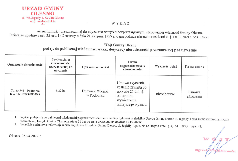 Wykaz nieruchomości przeznaczonej do użyczenia w trybie bezprzetargowym, stanowiącej własność Gminy Olesno