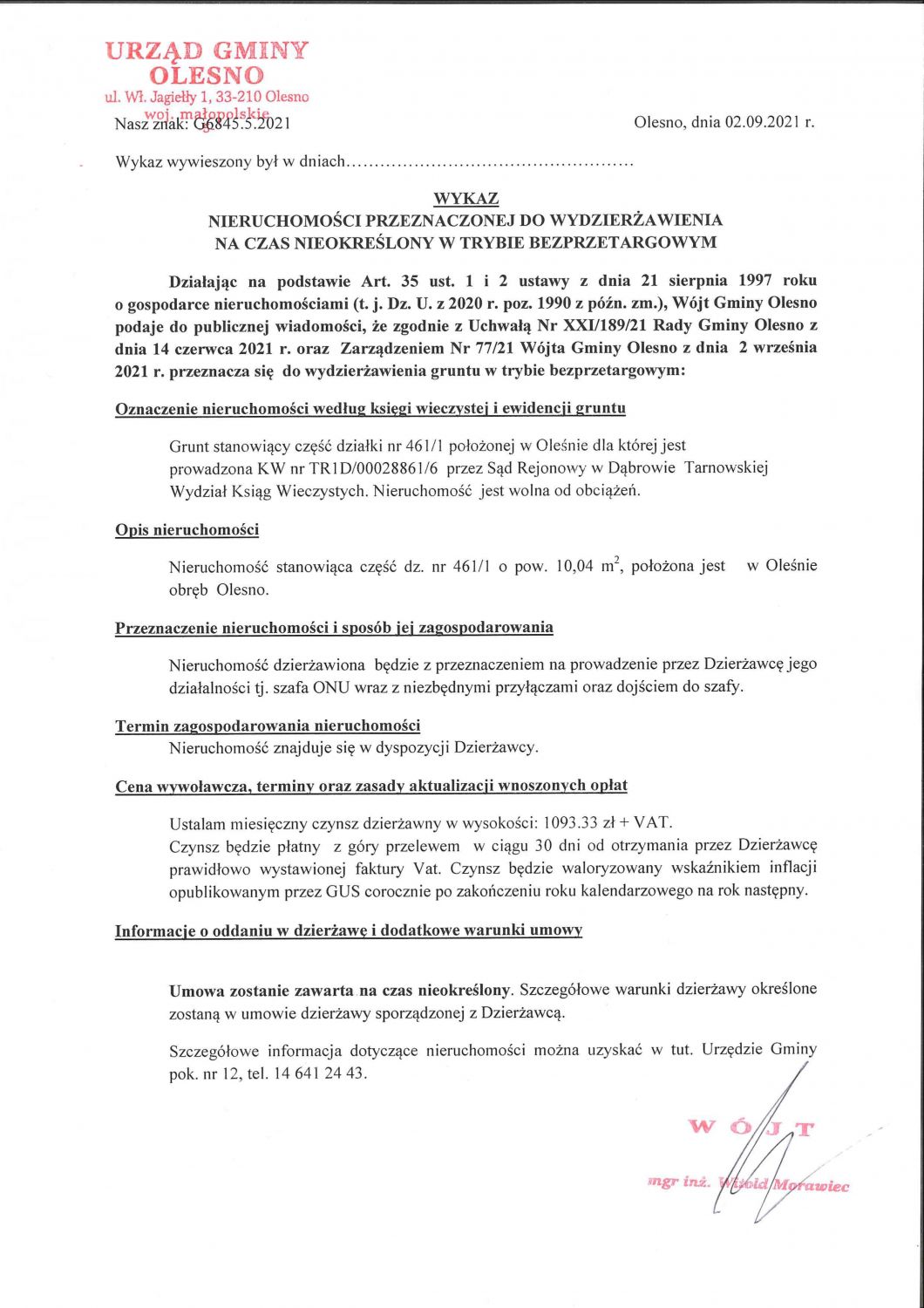 Wykaz nieruchomości przeznaczonej do wydzierżawienia na czas nieokreślony w trybie bezprzetargowym
